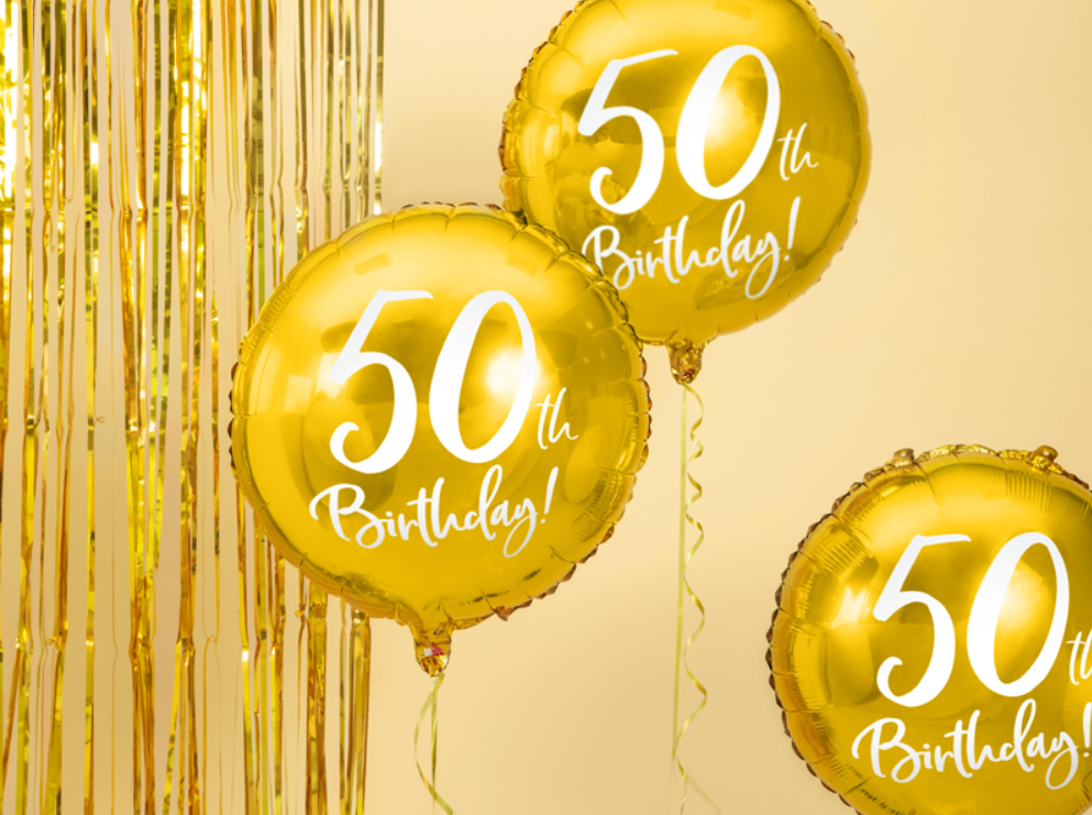 Apvalus, aukso spalvos jubiliejinis balionas.